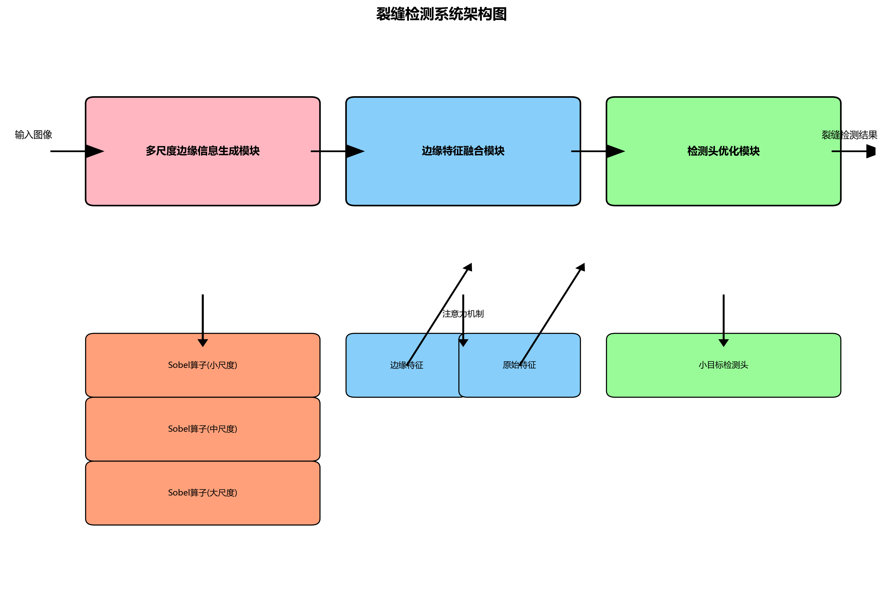 多尺度边缘信息生成模块通过不同尺度的Sobel算子提取多层次的边缘信息,捕捉裂缝的不同特征;边缘特征融合模块采用注意力机制自适应地融合边缘特征和原始特征;检测头优化模块引入了专门针对裂缝特征的检测头,提高对小目标的检测能力。