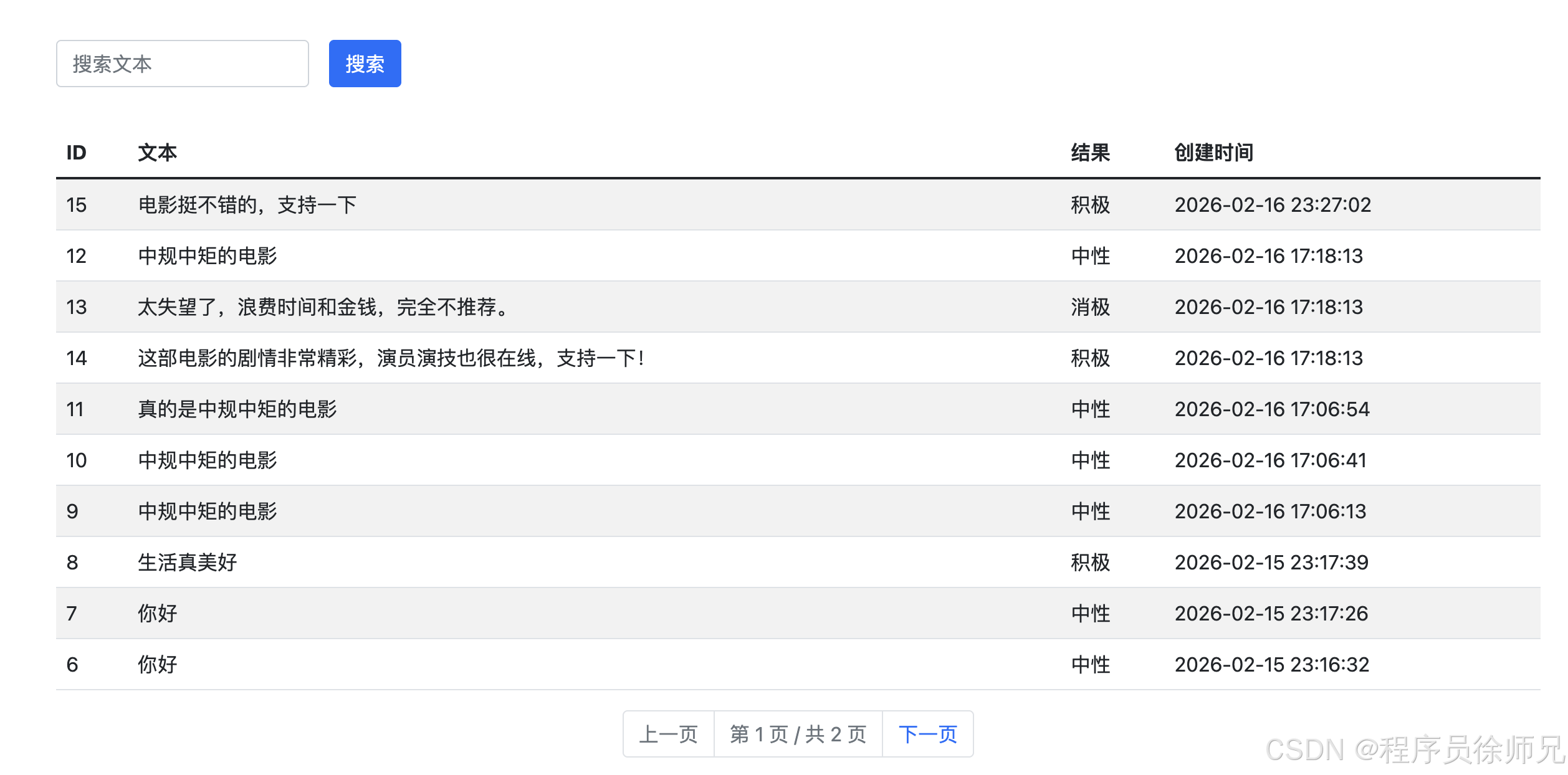 - Web 页面:HTML + ECharts 或后台 Matplotlib,将情感统计用饼图、折线图、词云等形式展示;
