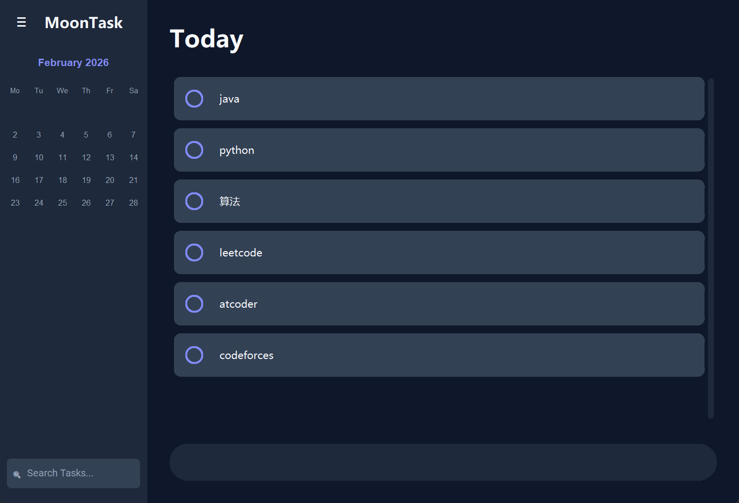 市面上的 Todo 软件很多,但大多繁杂。我希望有一款工具,既能记录每日任务,又能在我完成工作后,给我一句古诗词作为精神奖励。于是,MoonTask 诞生了。
