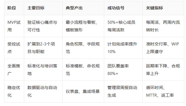 为帮助团队明确四个阶段的目标、产出与成功信号,以下表格给出对比视图。通过对齐阶段性目标与量化指标,小团队可以形成"目标---举措---信号---数据"的闭环,从而更快从试用跨越到稳定使用。表内"关键指标"建议按阶段收敛,避免过度度量导致的执行负担,并在阶段复盘时进行调整与升级。
