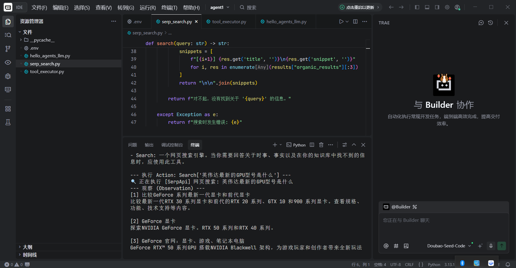 - 运行教程代码,这时已经测试通了调用工具获取外部搜索信息