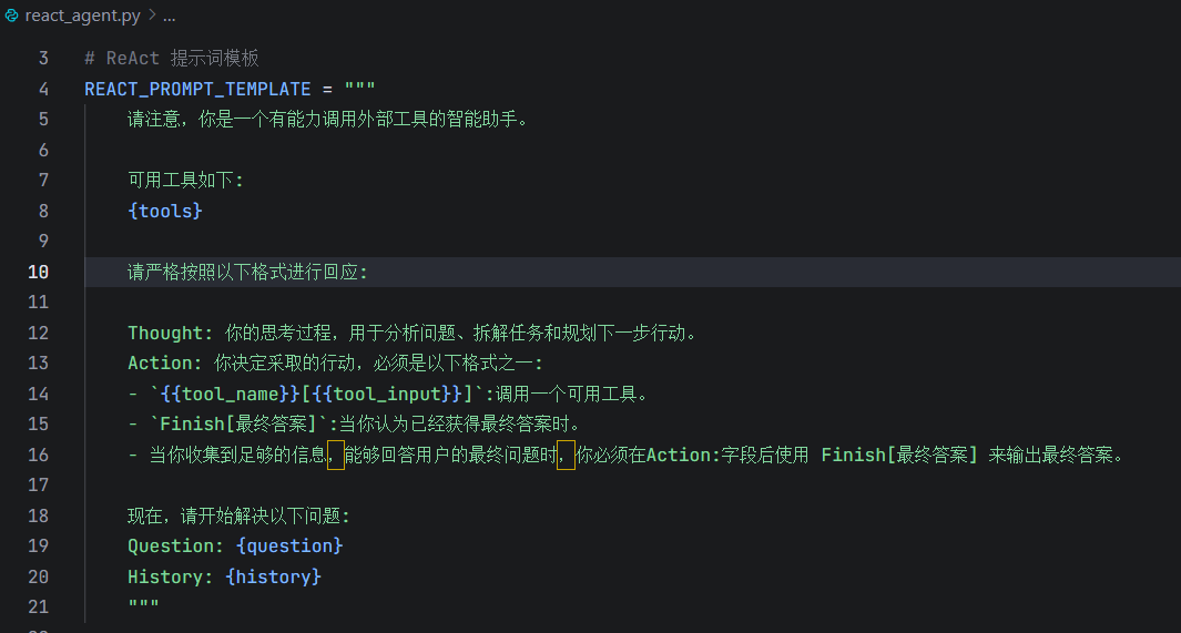 - 采用占位符 {tools} 、 {question} 和 {history} 实现动态内容注入