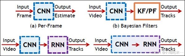 很多复杂任务同时具备空间特征 和时序特征,单一网络无法满足需求,此时可将 CNN 和 RNN 结合,发挥各自优势,这也是实际应用中的常用方案: