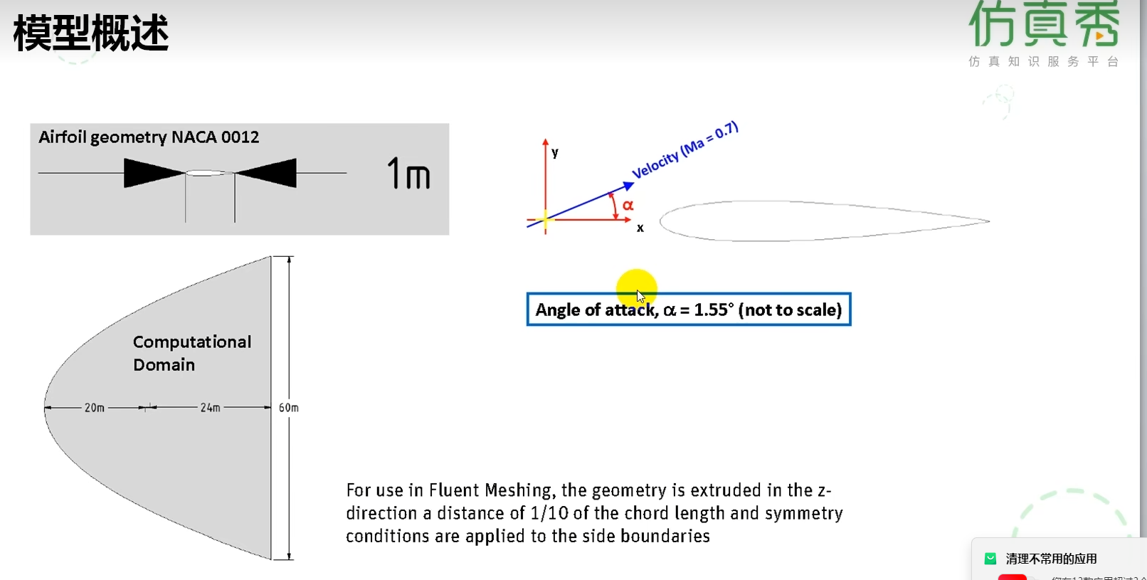 模型简化与网格策略:备注说明将在垂直方向(Z向)拉伸1/10弦长并施加对称边界条件。这实质上是将问题简化为二维模拟(使用一层网格单元),并利用对称性来模拟无限展长翼型的流动,能极大降低计算成本,是处理此类典型二维翼型问题的标准方法。