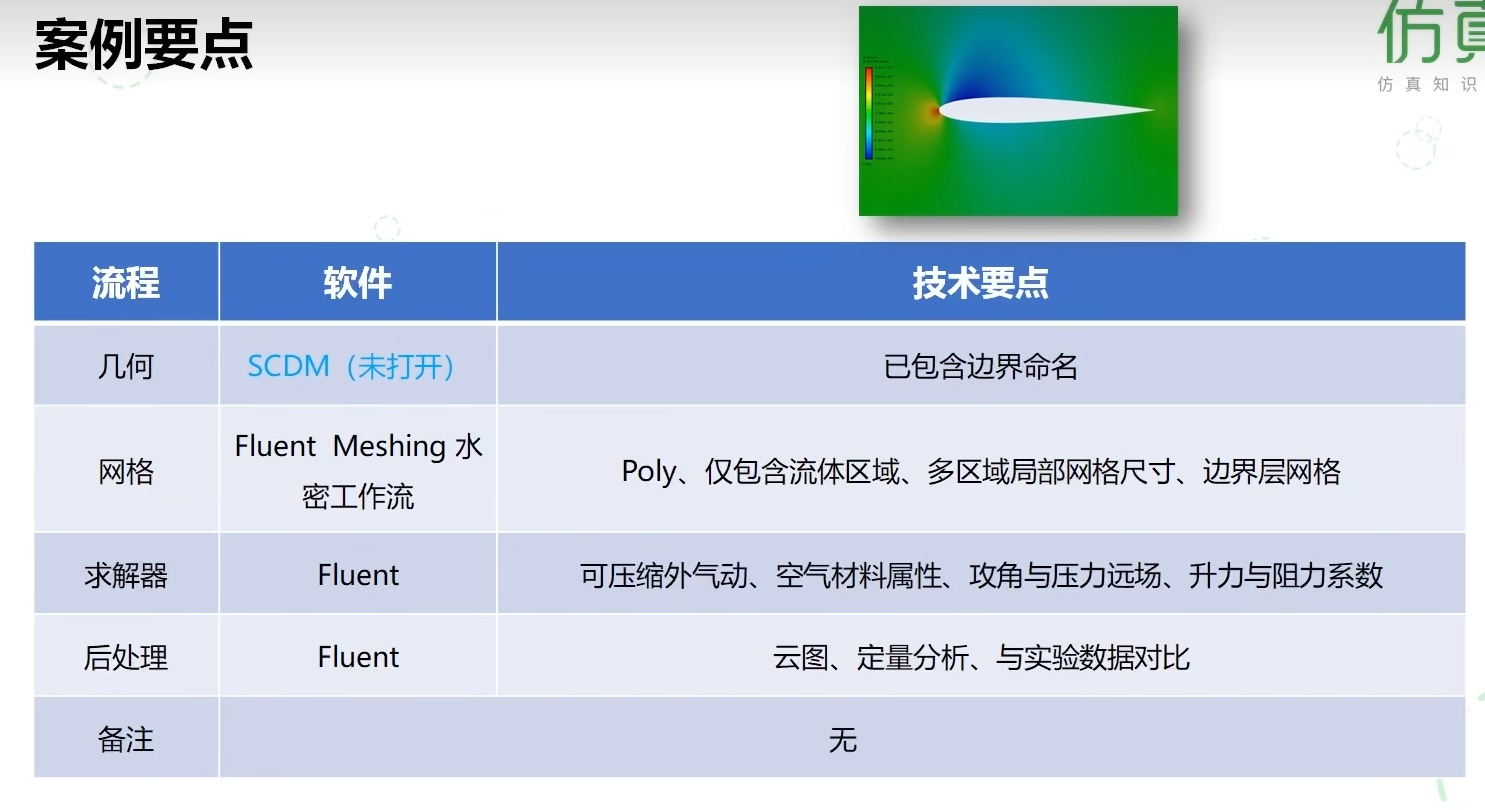 完整流程包括前处理(使用SCDM进行几何定义与边界命名)、网格划分(采用Fluent Meshing水密工作流生成多面体网格与边界层)、求解计算(在Fluent中设置可压缩流、压力远场边界并监控力系数)以及后处理(结果可视化与实验数据对比)。这完整实践了从几何到报告的标准化工程项目执行。