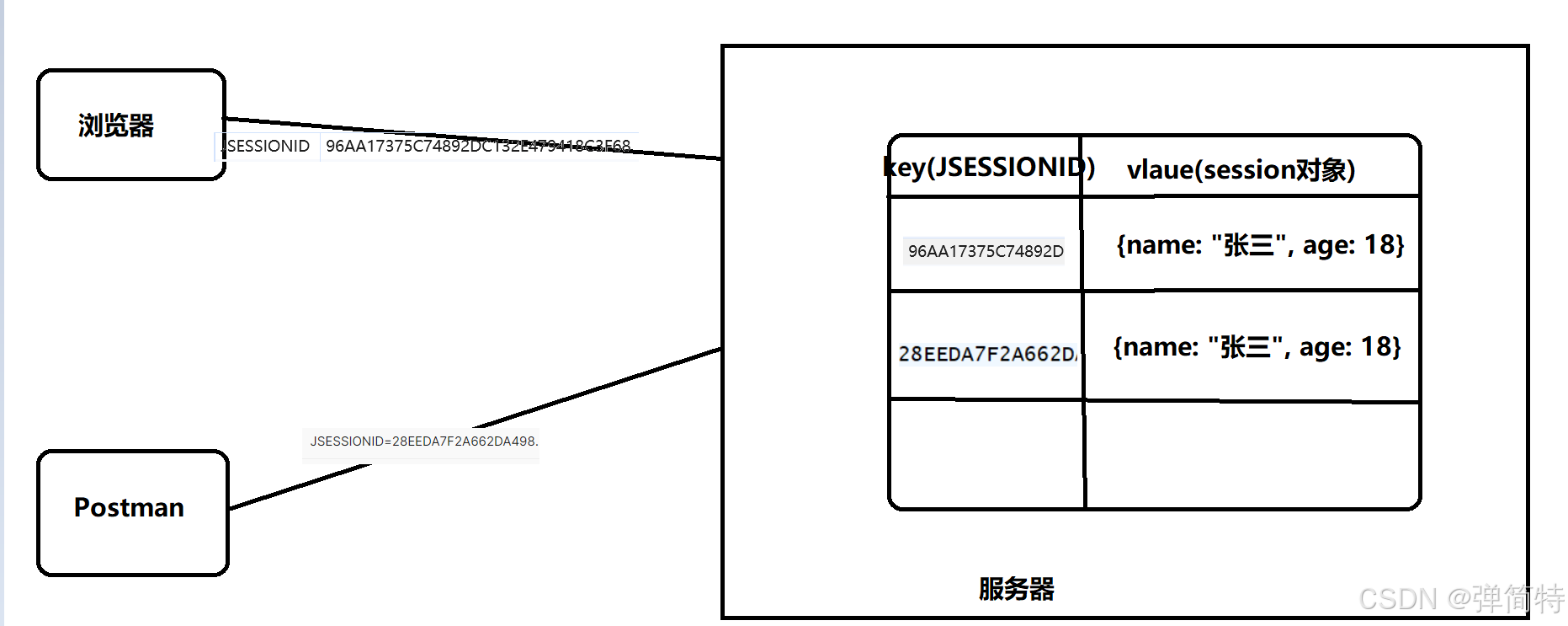 7)那么同样的道理,不同的软件发起的请求就是不同的客户端,使用Postman请求的时候后端也会产生唯一的SessionID,也会被Postman存起来,下一次请求自动带上。