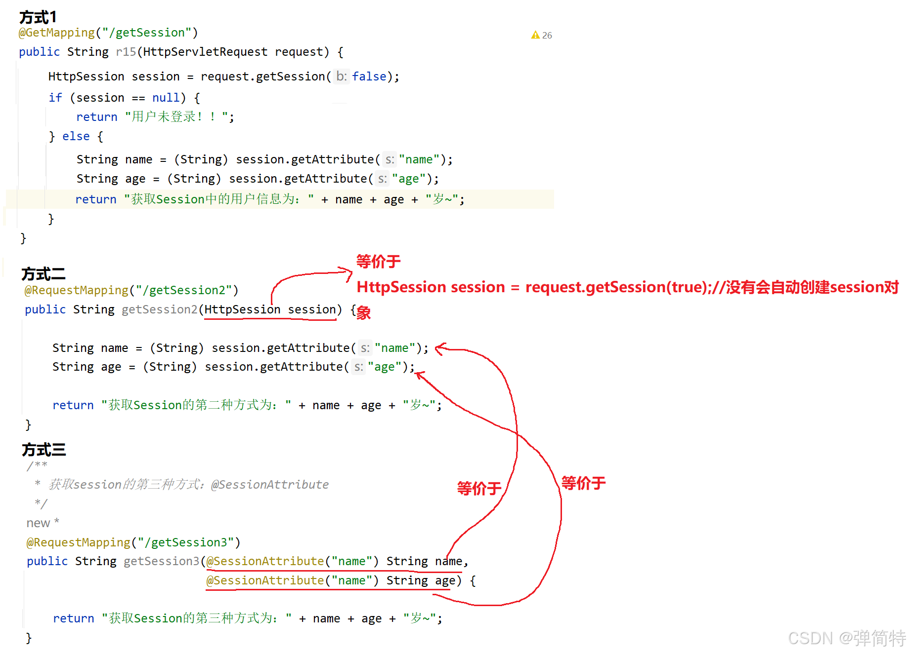 request.getSession(); - 常规存/取,不想写多余代码 → 用HttpSession参数;
