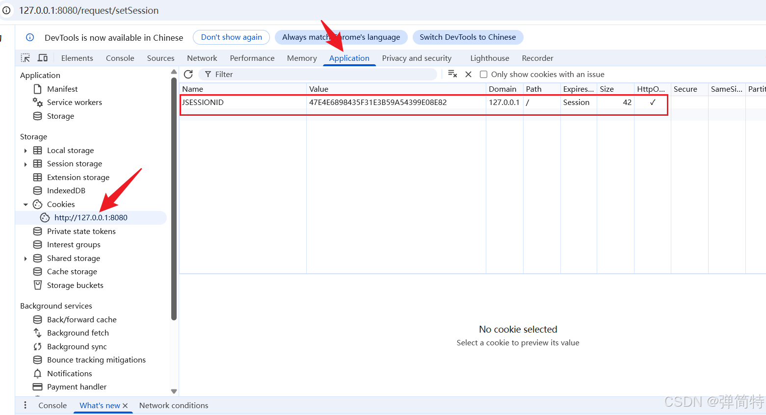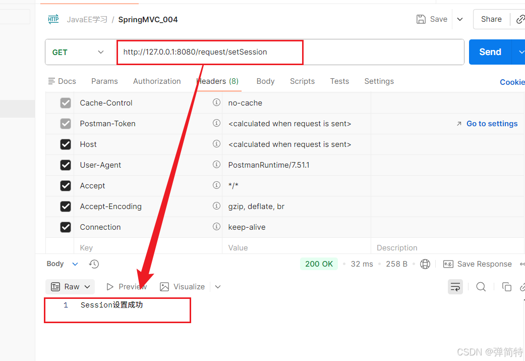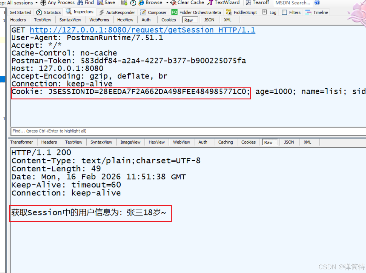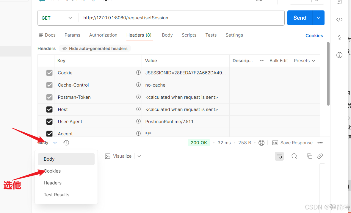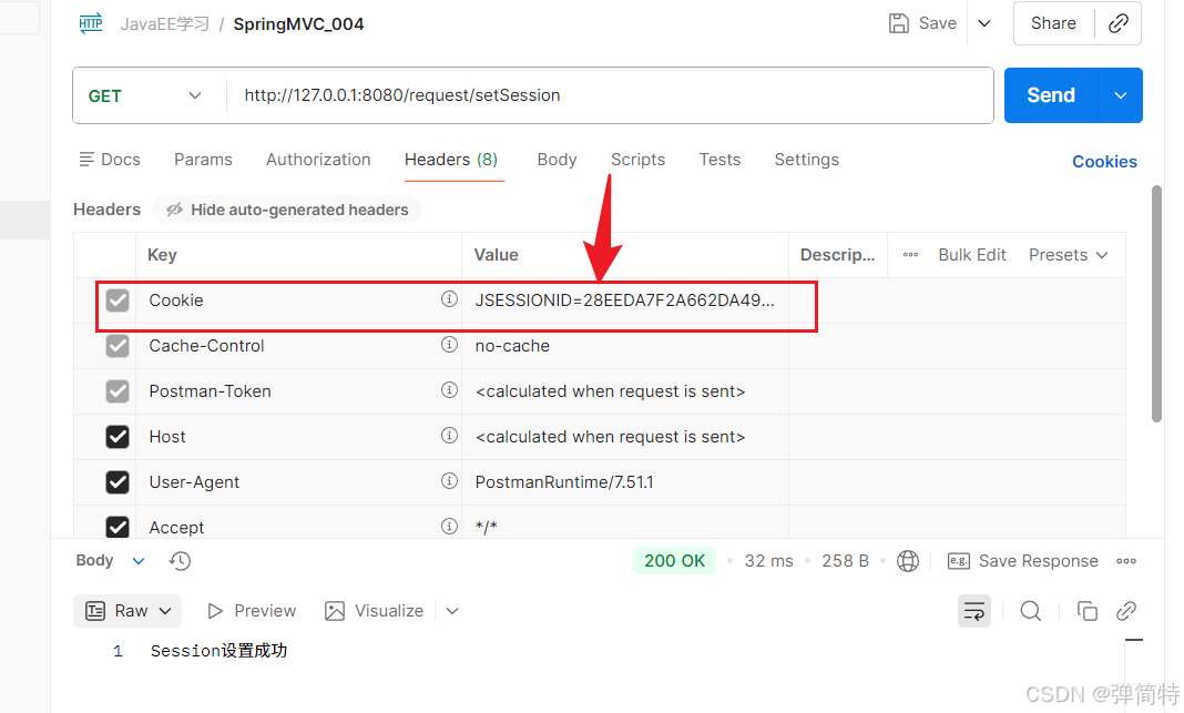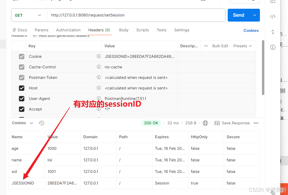 一旦请求成功之后,我们的Postman就会将SessionID给自动设置到Cookie中