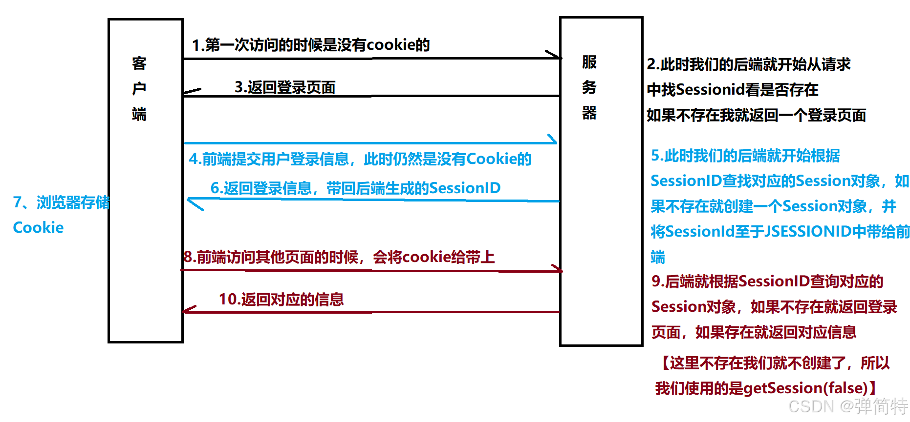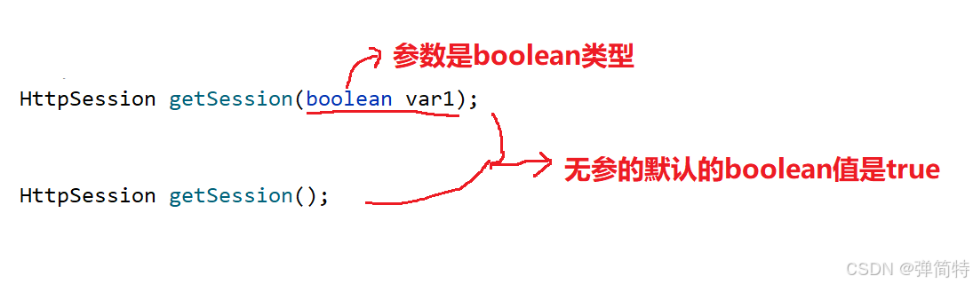 HttpSession getSession();默认是true,那么参数为true,我们前面说过他底层的原理就是根据SessionID去找有没有对应的Session对象,有就将对象返回。如果没有就会创建一个Session对象并返回【会生成一个唯一的 SessionID(如JSESSIONID=88F9E7D234567890),同时通过响应头Set-Cookie: JSESSIONID=xxx; Path=/把这个 SessionID 传给客户端(浏览器),浏览器会把这个 Cookie 保存下来。】 - 其次有参数的