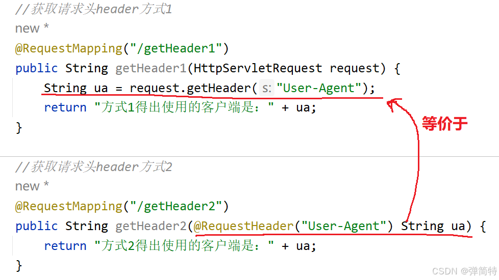 @RequestHeader("User-Agent") String ua 等价于 String ua = request.getHeader("User-Agent");