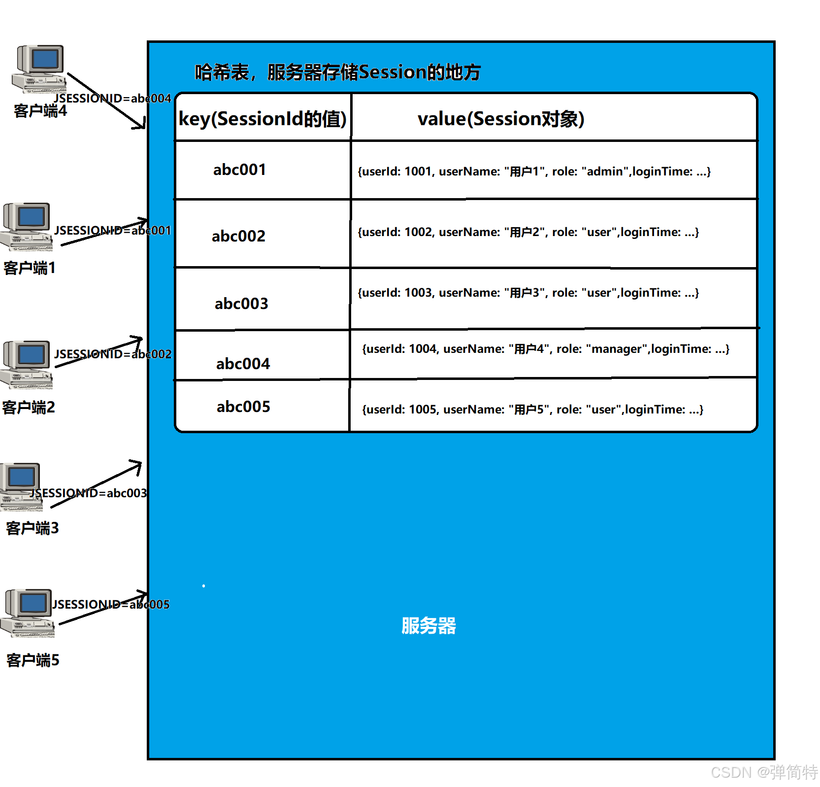 - 医院内部有一个巨大的病历档案柜(服务器内存中的 Session Map)。