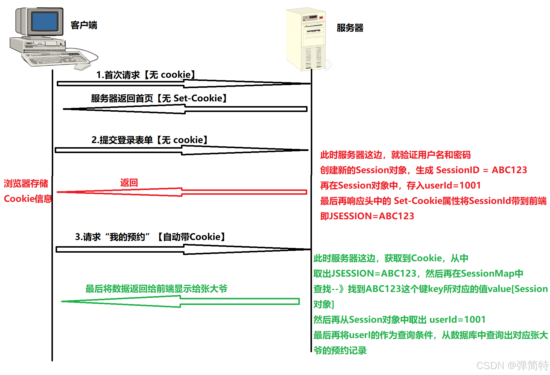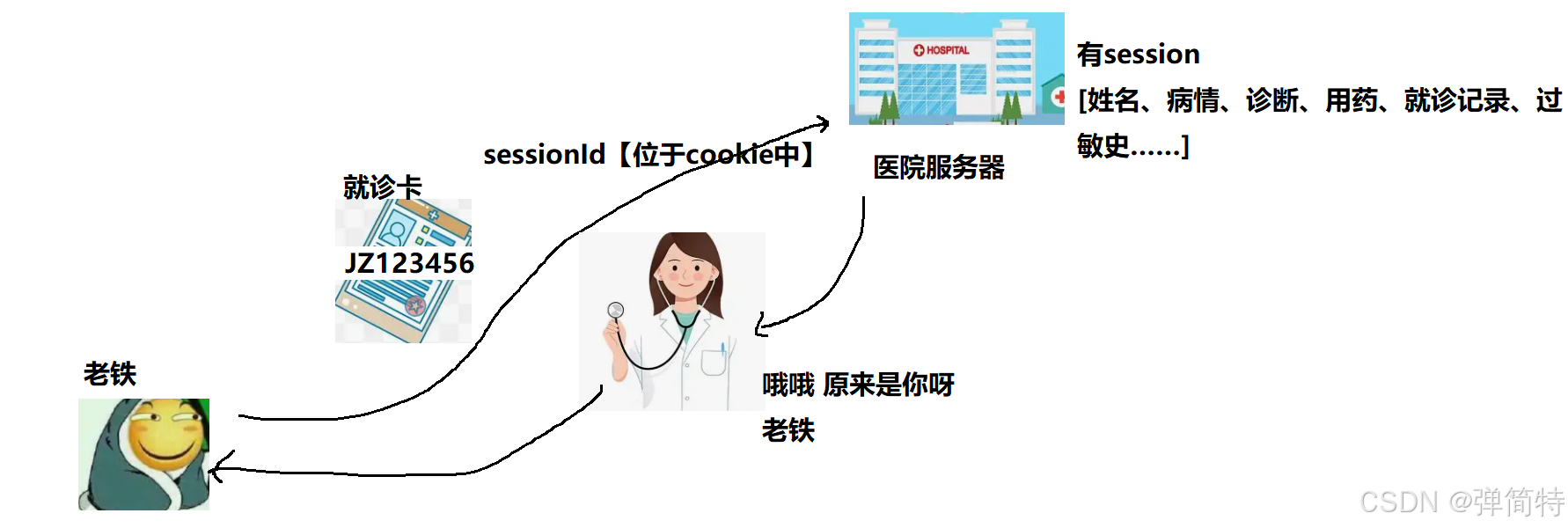 - 必须通过就诊卡上的编号(Cookie 里的 SessionID),才能找到你的档案
