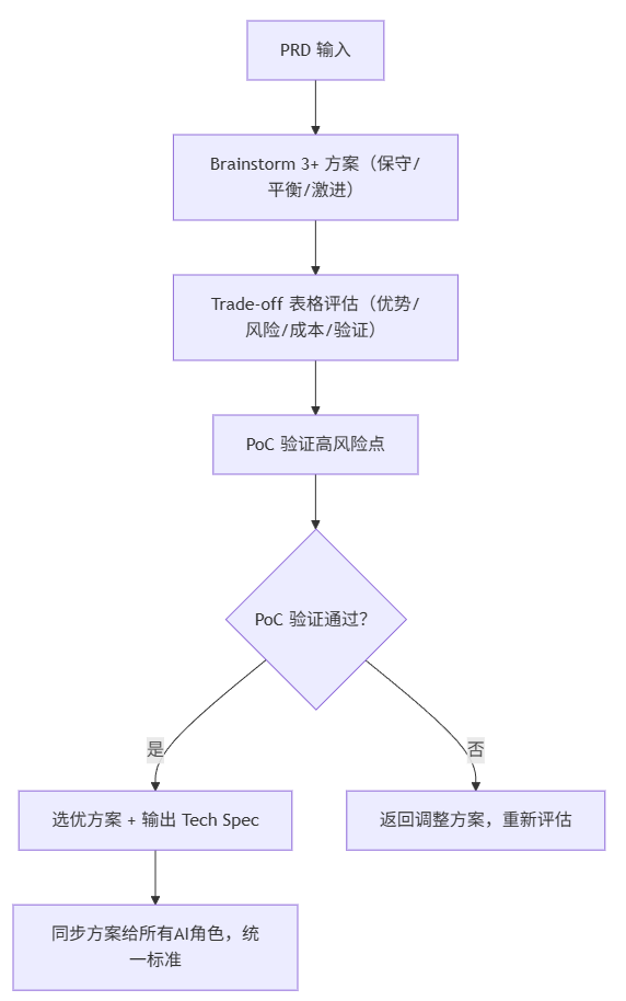 通过多方案 brainstorm,对比不同方案的优劣、风险和成本,再通过PoC验证高风险点,最终选择最贴合业务价值、最稳妥的方案,给后续编码定好"统一标准",让AI所有角色都围绕同一个方案发力,避免冲突和无效开发。