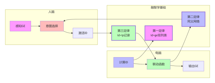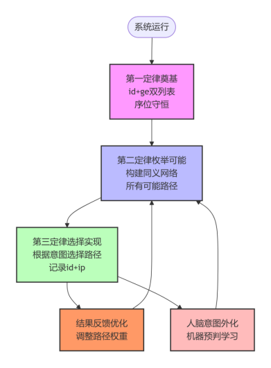 第三定律 的运作分为三步:语境激活:当前语境激活一组相关的同义(id+ge)路径。意图选择:主体(人或机器)根据意图选择一条路径。路径记录:被选中的路径以(id+ip)形式记录。
