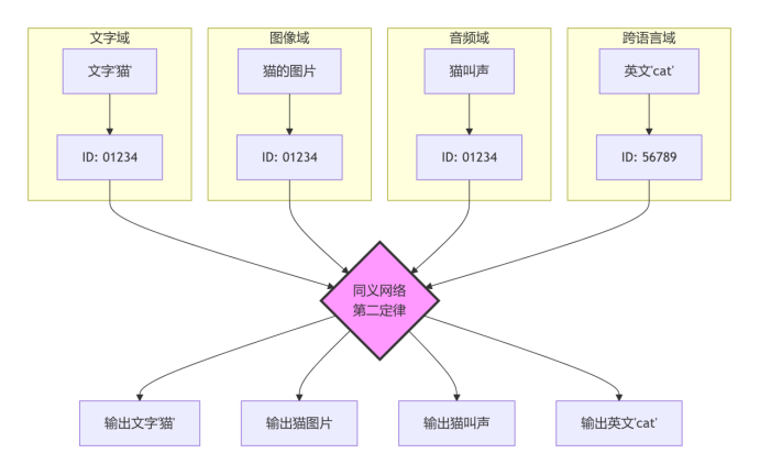 第二定律 构建跨模态、跨层级的同义网络。文字、图像、音频、视频等不同模态的表达,只要映射到相同的ID+序列,就属于同一个同义类。这为跨模态转换提供了确定性的数学基础:文字→图像、图像→文字、跨语言翻译等,都成为基于ID+序列的精确映射,而非统计拟合。