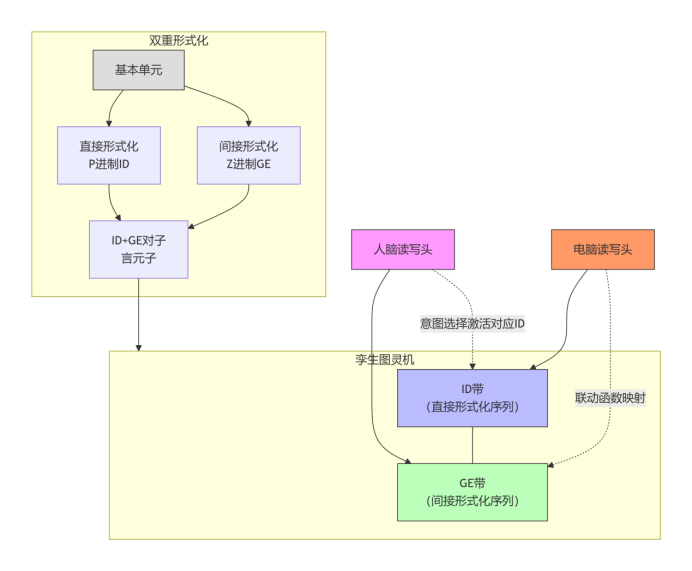 图3解读 :本图呈现了融智学的核心硬件原型------孪生图灵机,以及其基础------双重形式化。上半部分(双重形式化):每个基本单元(如汉字)经过双重处理:直接形式化:赋予唯一的P进制数字ID(机器可操作);间接形式化:赋予Z进制符号GE(人类可感知);ID与GE结合为"言元子"------意义的基本量子。下半部分(孪生图灵机):双格带:ID带存储数字序列,GE带存储符号序列,两者通过联动函数绝对同步。