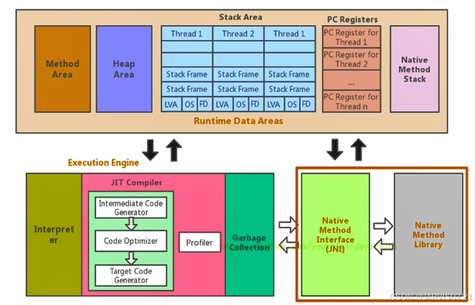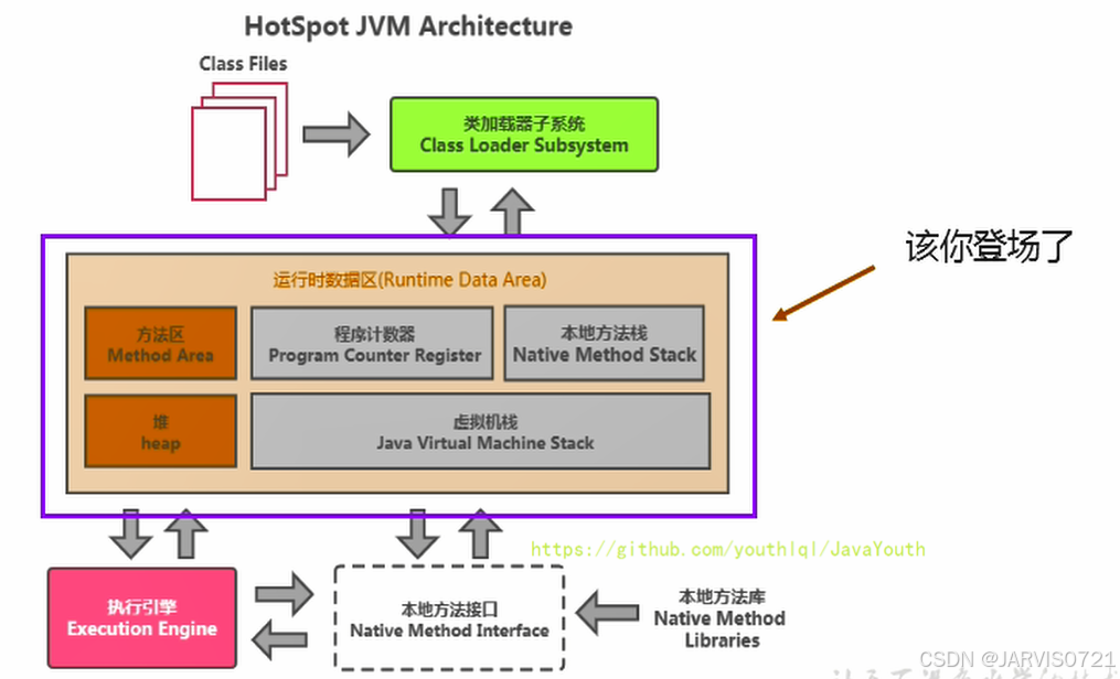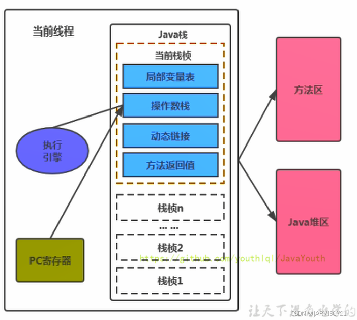 当我们通过前面的:类的加载→链接(验证→准备→解析)→初始化,这几个阶段完成之后,就会用到执行引擎对我们的类进行使用,同时执行引擎将会使用我们的运行时数据区