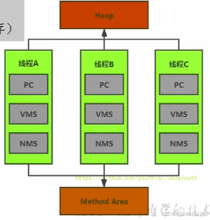 线程共享:堆、堆外内存(永久代/元空间、代码缓存)