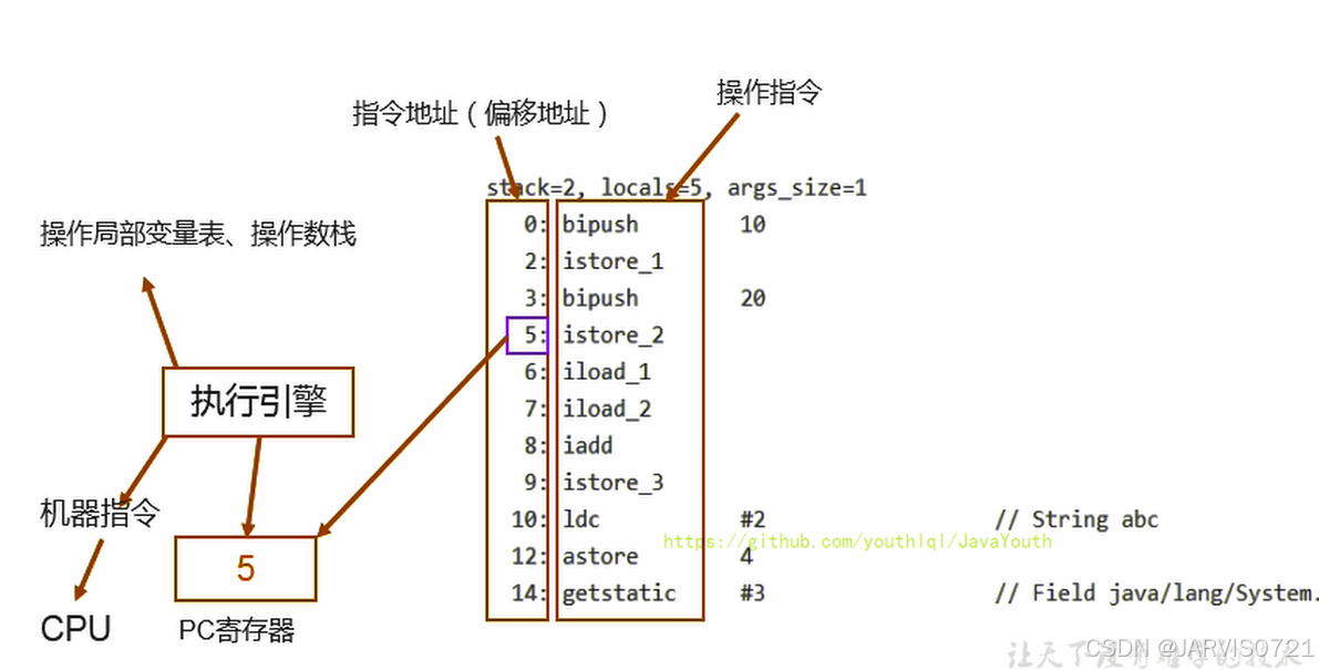 左边数字代表的是指令地址(指令偏移量),也是PC寄存器当中可能存储的值,然后执行引擎读取PC寄存器当中的值,执行对应的指令。