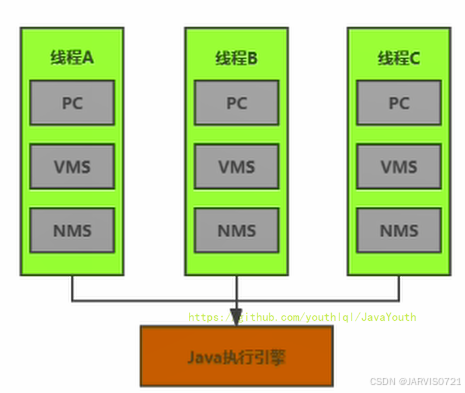 为保障线程在被挂起之后,下次能够从准确的位置恢复执行,JVM在内存当中为每个线程分配了私有的PC计数器、虚拟机栈。