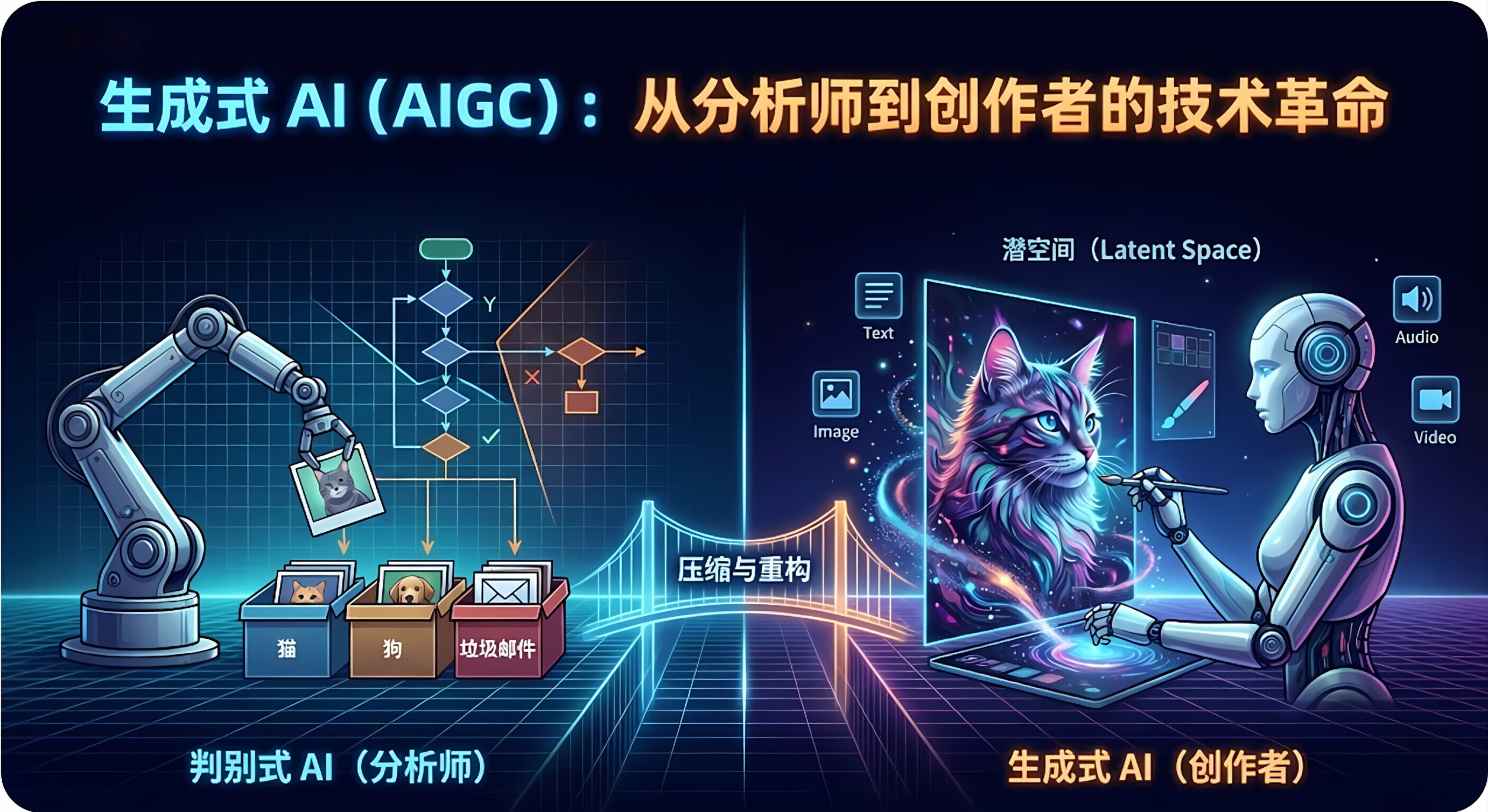 它不再满足于仅仅理解 这个世界(比如识别照片里是不是猫),而是开始创造这个世界(比如画一只从未存在过的猫)。