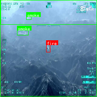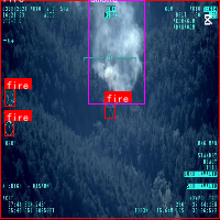 上图为SAR图像火情检测的实际应用效果,画面中央偏上位置有一片明显的烟雾区域,呈灰白色云雾状,边缘模糊且向四周扩散,显示出火灾产生的烟气特征。烟雾下方对应位置标注有"fire"红色标识,明确指示火源所在。画面左侧和下方也分布着多个"fire"标识,表明存在多处疑似火点。这种多目标检测能力对于复杂火灾场景的监测至关重要,能够帮助消防部门全面掌握火情发展态势。
