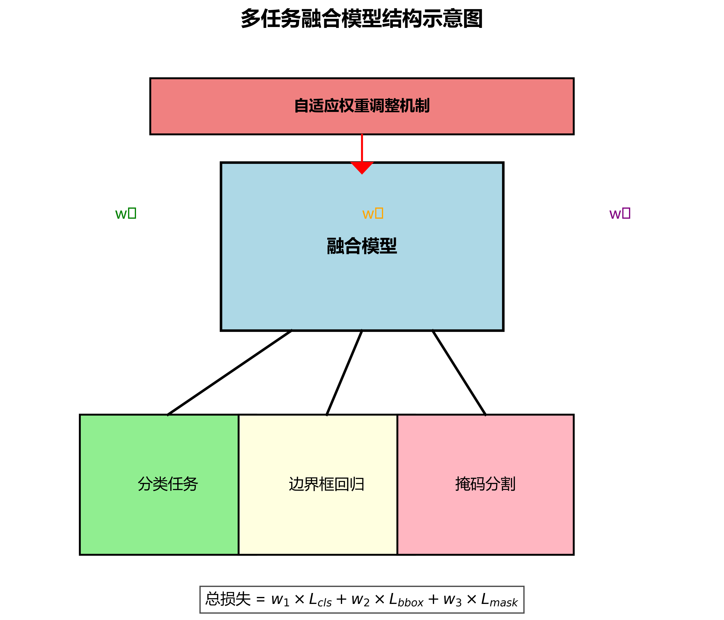 为了有效训练融合模型,我们设计了一种多任务损失函数,结合了分类损失、边界框回归损失和掩码分割损失。特别地,我们引入了自适应权重调整机制,使不同任务在训练过程中能够动态调整其贡献度,从而更好地平衡不同任务之间的优化目标。