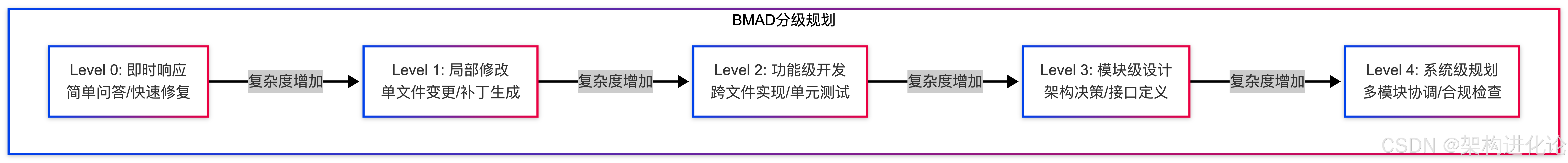 BMAD最独特的贡献是Level 0-4分级规划,根据任务复杂度动态调整AI的介入深度: