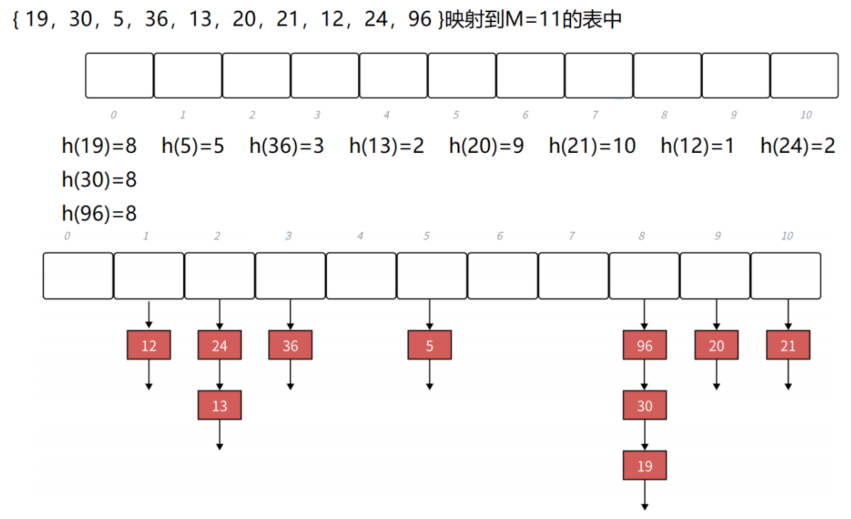 - h(key)=hash0=key % M ,hash0位置冲突 了,则线性探测公式 为:hc(key,i)=hashi=(hash0+i) % M,i={1,2,3......M-1} 。由于负载因子小于1,哈希表中一定有空位置,所以最多探测M-1次,一定能找到一个存储key的位置。