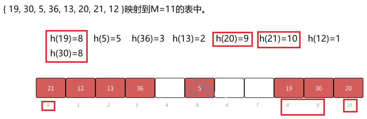 - 从发生冲突的位置开始,依次线性向后探测,直到寻找到下一个没有存储数据的位置为止,如果走到哈希表尾,则回绕到哈希表头的位置。