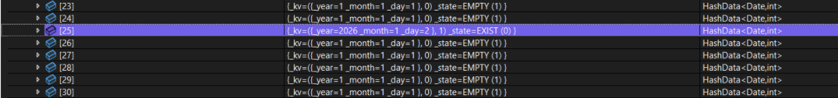 初始时哈希表的大小M可以为 __stl_next_prime(0),即M=53,此时M既不接近25,也不接近26,同时也是素数。扩容后M=97,也实现了近似2倍扩容。