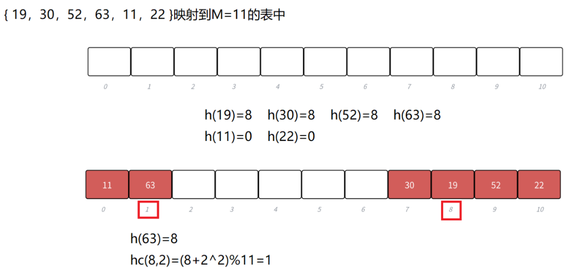 - 从发生冲突的位置开始,依次左右按二次方跳跃式探测,直到寻找到下⼀个没有存储数据的位置为止,如果往右走到哈希表尾,则回绕到哈希表头的位置;如果往左走到哈希表头,则回绕到哈希表尾的位置。