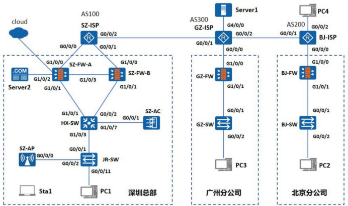 | 深圳总部防火墙 ZB-FW-A | GE1/0/0 | 1.1.1.1/24 | Untrust | SZ-ISP |