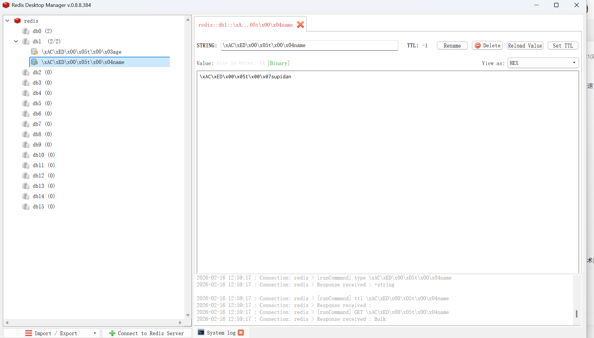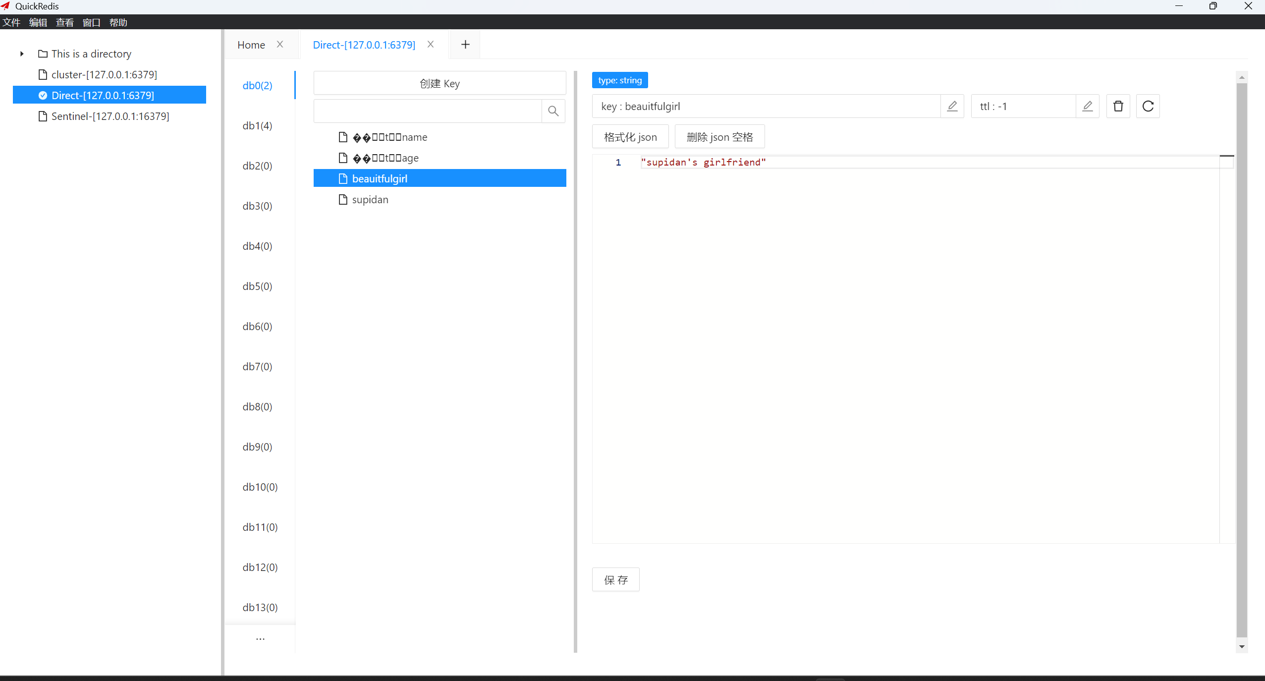 上面key是经过序列化的,所以QuickRedis无法正常查看但是使用使用RedisDesktopManager可以看到"supidan",值同样也是经过序列化的。