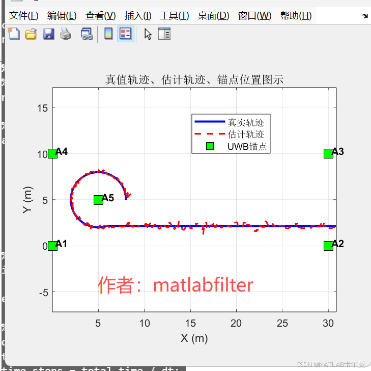 该程序构建了一个二维平面下的 UWB 与 IMU 紧耦合定位导航系统仿真框架,采用扩展卡尔曼滤波(EKF)进行多源信息融合,实现: