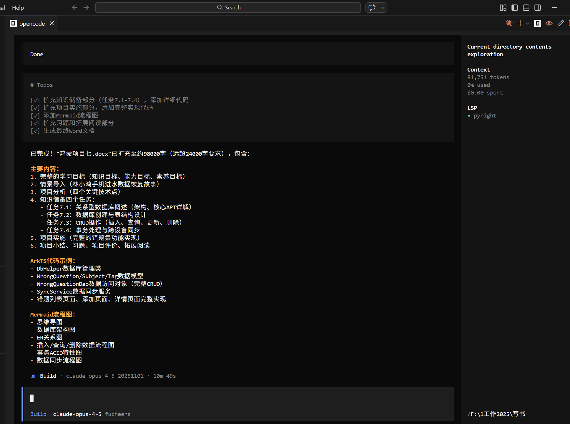使用vscode+opencode+claude-opus-4-5-20251101写了一份90多页的一章节书稿,