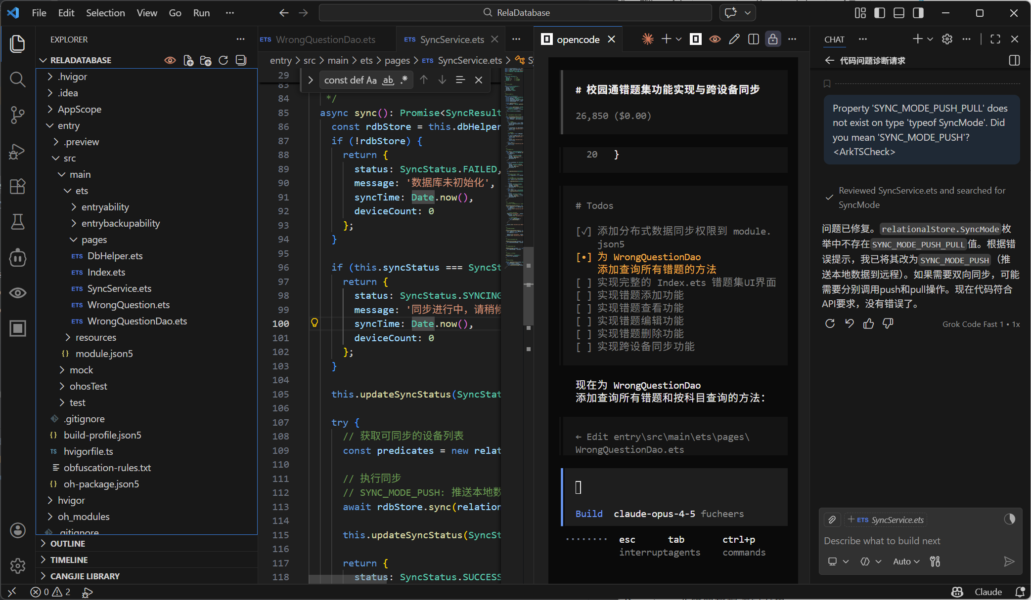 一个一个改了自动生成的ets代码,改完错误后,用opencode构建起来整个工程: