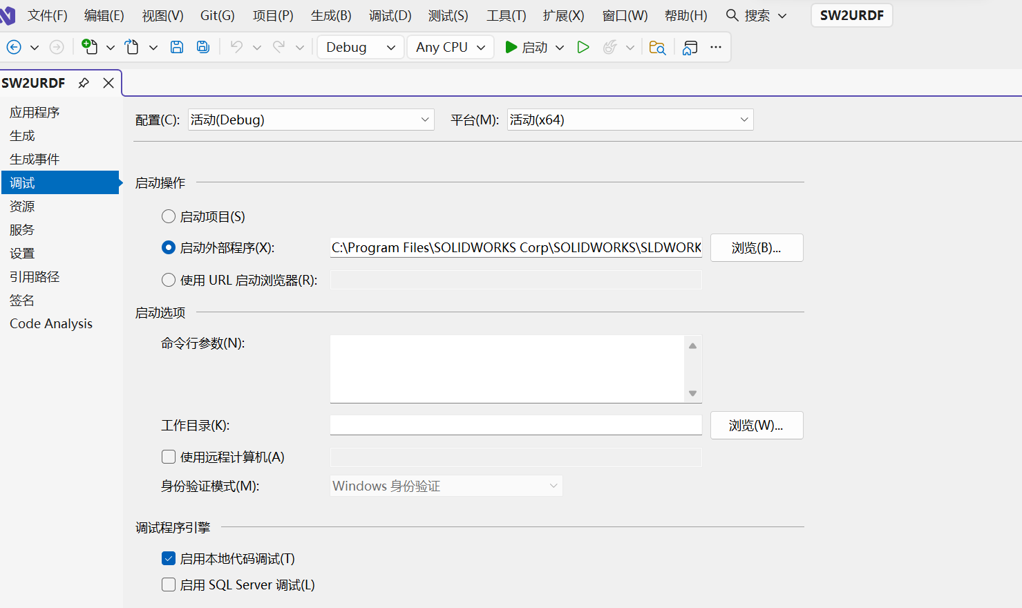 - 选择SW2URDF项目,配置项目属性 :右键SW2URDF项目->选择"属性"->"调试"菜单栏->"启动外部程序"部分选择solidworks的运行文件,默认(C:\Program Files\SOLIDWORKS Corp\SOLIDWORKS\SLDWORKS.exe)
