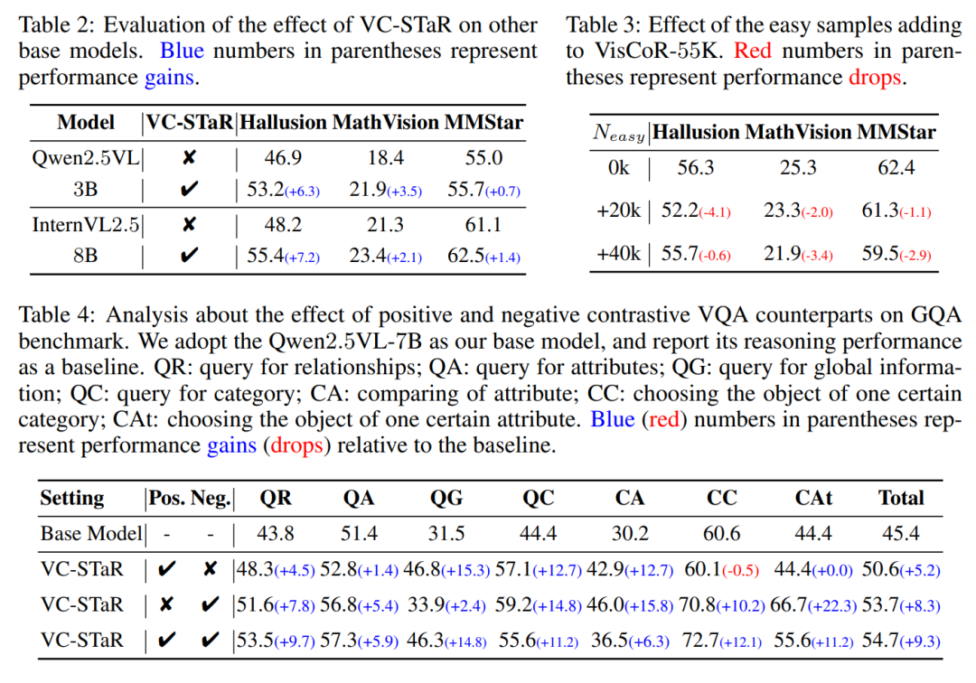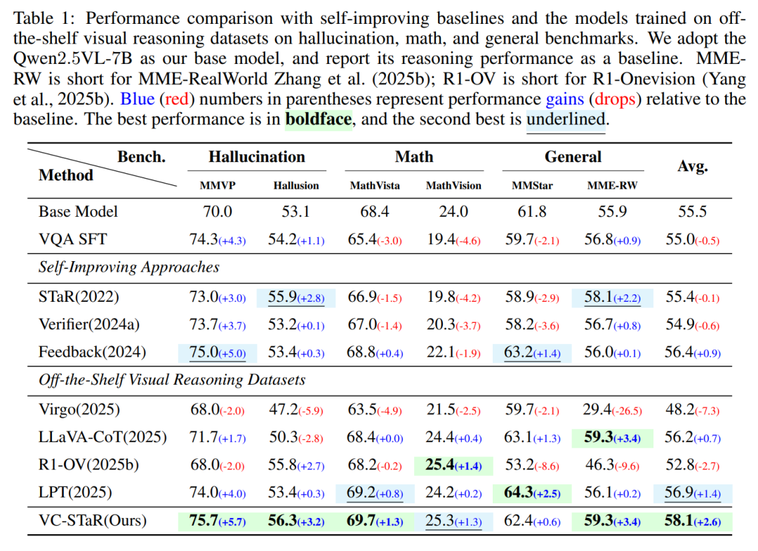 优于自改进基线:相比STaR、Feedback等方法,VC-STaR避免了"提升幻觉性能却牺牲数学/通用推理"的 trade-off;