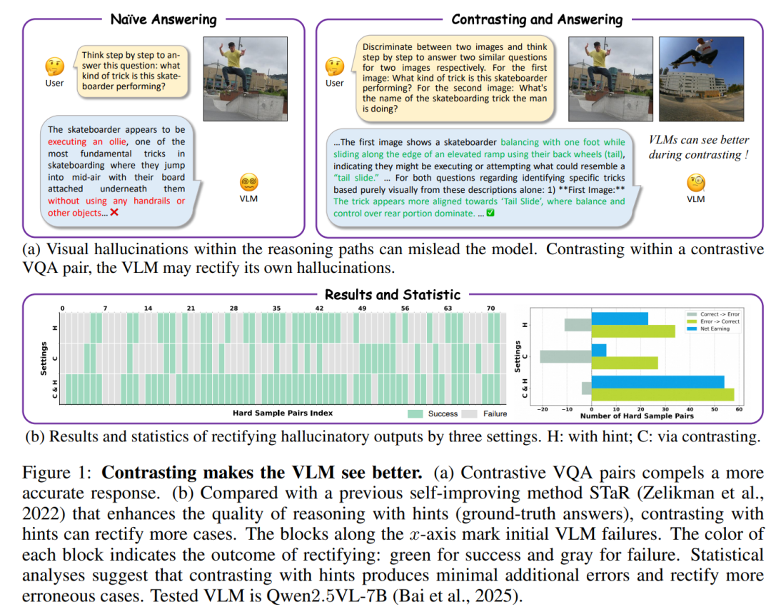 第二步(对比):引入对比式VQA对,让VLM对两个视觉相似、问题同义的样本进行对比分析,提炼更可靠的视觉证据(相同答案总结共性,不同答案凸显差异);