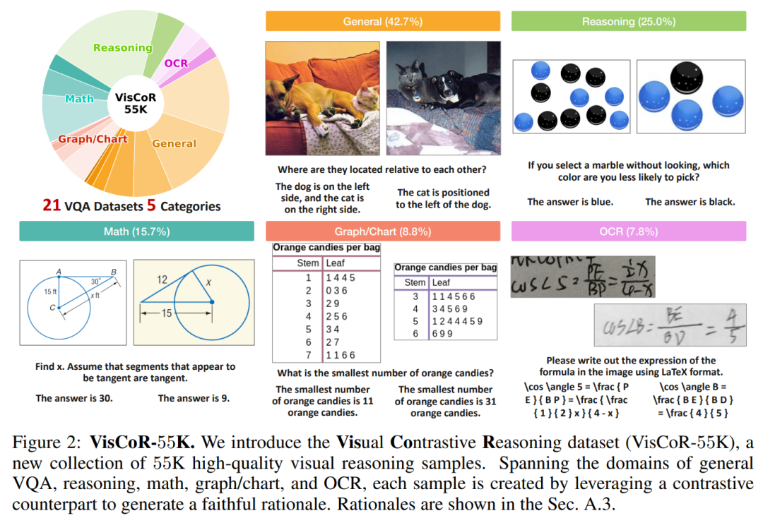 基于上述流程,团队生成了包含5.5万条样本的Visual Contrastive Reasoning(VisCoR-55K)数据集,每个样本均附带经对比优化的高保真推理依据,覆盖多任务场景,为VLM微调提供优质数据支撑。