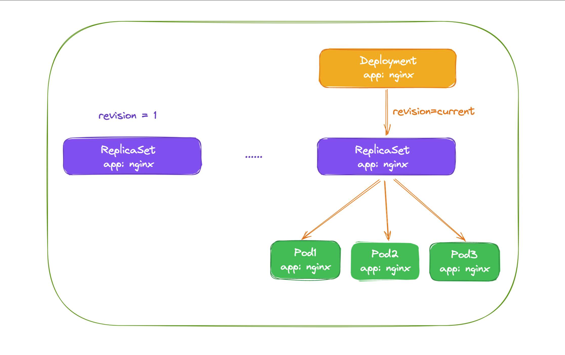 其中有这样的一个信息: Controlled By: Deployment/nginx-deploy,明白了吧?意思就是我们的 Pod 依赖的控 制器 RS 实际上被我们的 Deployment 控制着呢,我们可以用下图来说明 Pod、ReplicaSet、Deployment 三者之间 的关系: