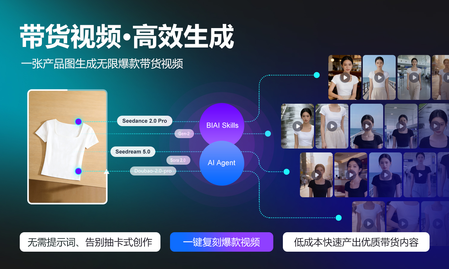 其实,豆包AIGC赋能春晚的"爆发能量",从来不止停留在央视舞台上。当它把这份经过春晚检验的赋能能力,联合火山引擎的底层云算力,与深耕AI视频生成赛道的新彼岸科技深度携手,就把春晚级的技术实力,搬进了电商人的日常------新彼岸科技打造的BIAI云控AI视频生成功能,正是双方合力的核心成果,它依托火山引擎的硬核算力,让电商人的营销也能实现"爆发式"高效,真正做到"所想即所得"。