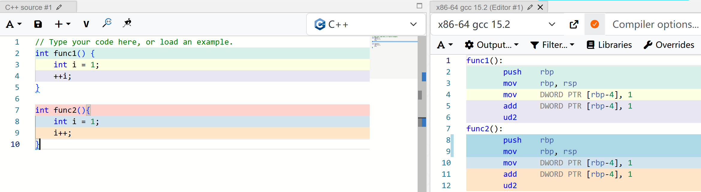 打开Compiler Explore,写一个简单、常见的前加(++i)的函数func1,再写一个后加(i++)的函数func2: