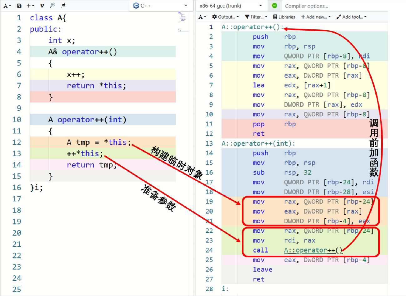 下面是C++的前加(++i)、后加(i++)操作符的重载函数,我们可以直观地感受一下它们在执行过程上的差异,如下图所示。