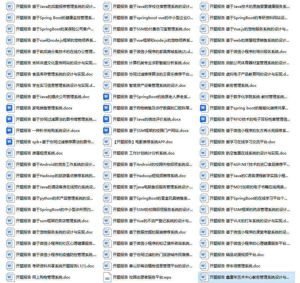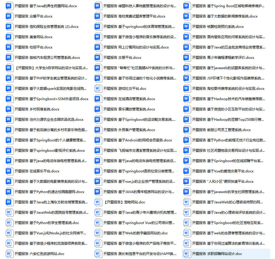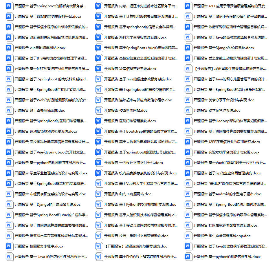 以上是某同学的毕业设计答辩的过程,如果你现在还没有参加答辩,还是开题阶段,已经选好了题目不知道怎么写开题报告,可以下面找找有没有自己符合自己题目的开题报告内容,列表中的开题报告都是往届真实的开题报告,可发送使用或参考。文末或底部来联xi可免费获取