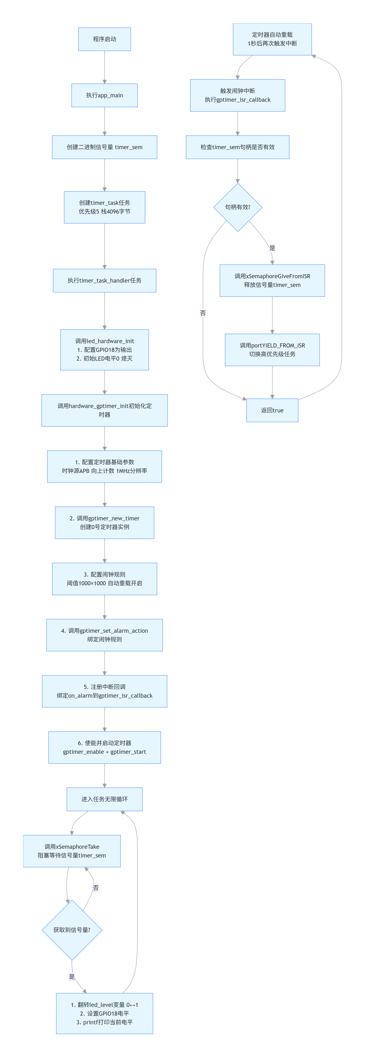 中断回调是 "中断的动作入口":当定时器触发中断时,会自动调用我们指定的函数,实现 "中断通知任务(释放信号量)" 的核心逻辑。