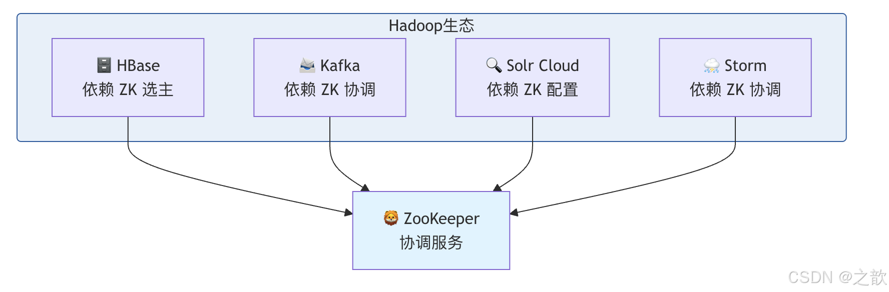 | Storm | ZooKeeper | Nimbus/Supervisor 协调、任务分配与心跳 |