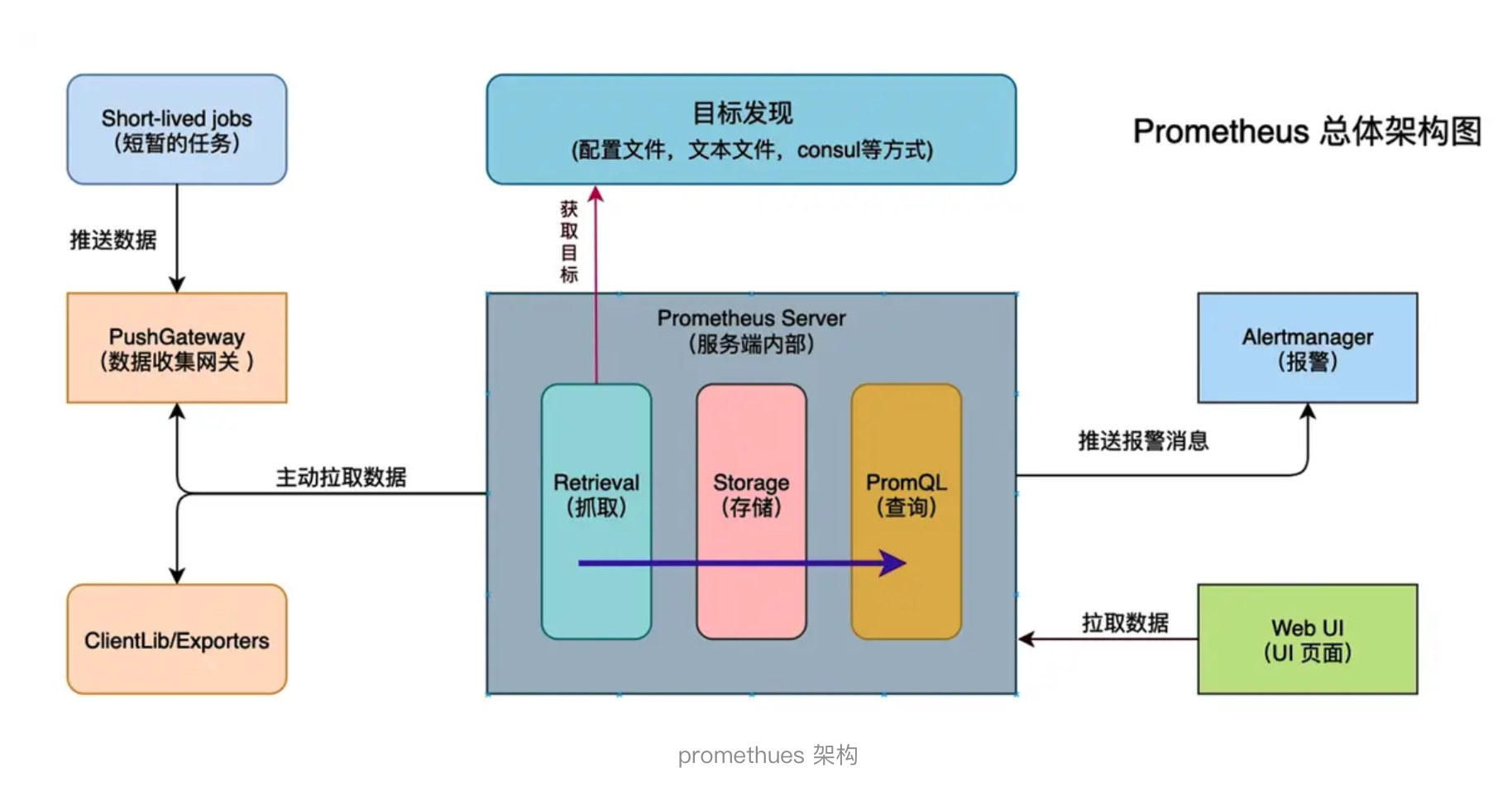 | Prometheus Server | 负责从配置的目标中定期拉取监控数据,存储为时间序列数据库,并根据报警规则生成告警。 |