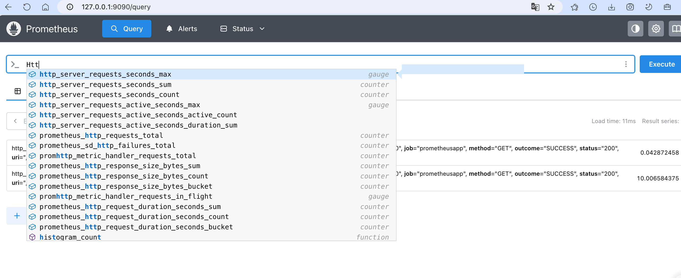 bashglobal: scrape_interval: 15s scrape_configs: - job_name: "prometheus" # metrics_path defaults to '/metrics' # scheme defaults to 'http'. static_configs: - targets: ["127.0.0.1:9090"] - job_name: 'prometheusapp' metrics_path: '/actuator/prometheus' static_configs: - targets: ['host.docker.internal:8080']